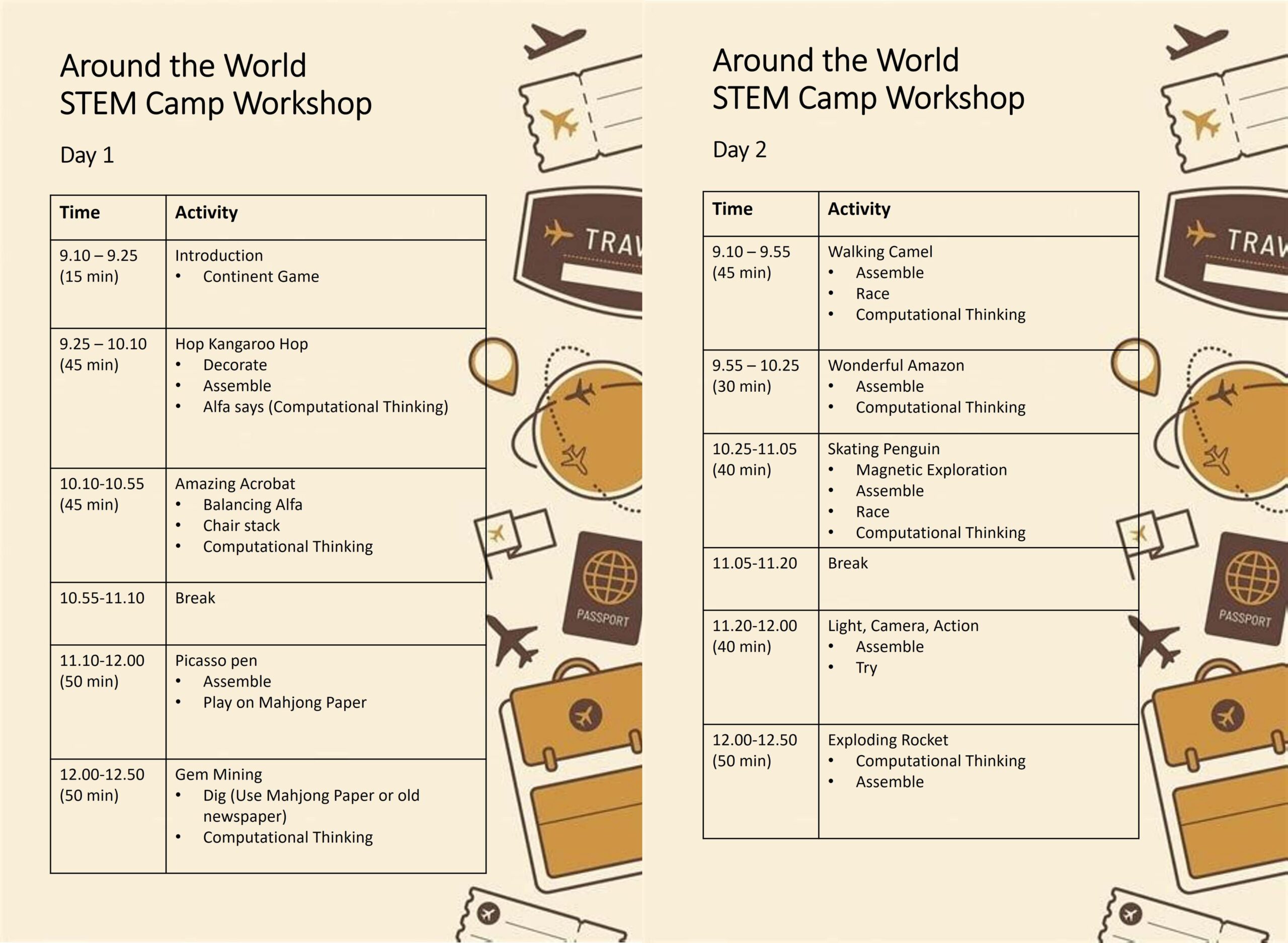 We will be doing 2 day workshop. Each experiment is estimated at around 30 to 50 minutes. Kindly refer to the timeflow. However, you are free to modify the time and extended activity according to the situation during workshop.