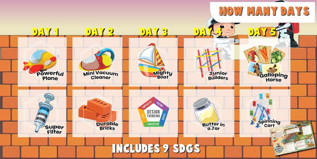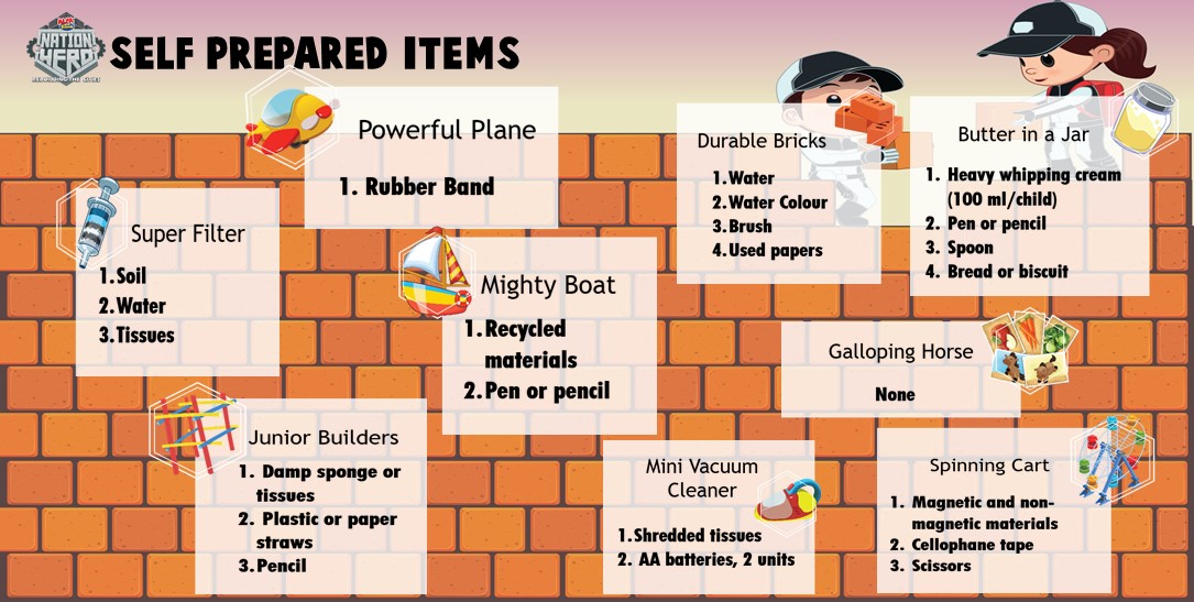 Prepare the experiment kit along with self-prepared items to assemble the kit. Once assembled, let the children explore the kit by themselves to see how it works. Then, proceed with extended activity if there is any to further explore the variables of the specific experiment. Next, ask the children to answer the question in the worksheet to reinforce the understanding. Last but not least, discuss with the children about what they learn and share some fun facts related to the issue portrayed in the camp. Repeat the same process for each experiment.