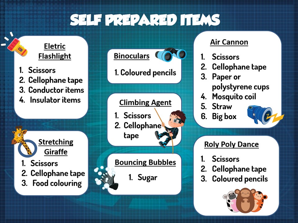 Prepare the experiment kit along with self-prepared items to assemble the kit. Once assembled, let the children explore the kit by themselves to see how it works. Then, proceed with extended activity if there is any to further explore the variables of the specific experiment. Next, ask the children to answer the question in the worksheet to reinforce the understanding. Last but not least, discuss with the children about what they learn and share some fun facts related to the issue portrayed in the camp. Repeat the same process for each experiment.