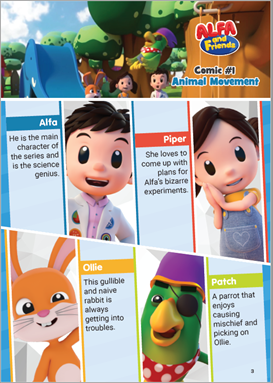 Flip through the comic stories Titled “Animal Movements” (page 3-11) with your child.