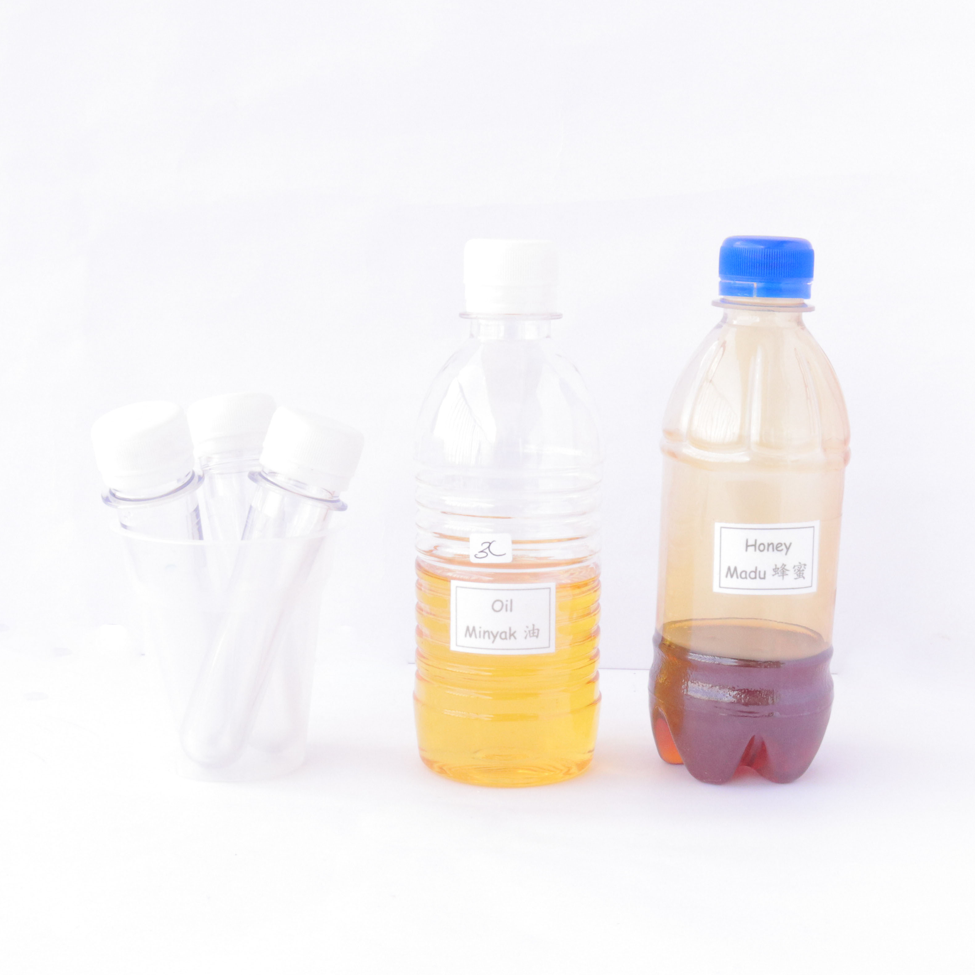 - Have your child to measure three spoonsful of water into his/her test tube. Now, add three spoonsful of honey into the same test tube.