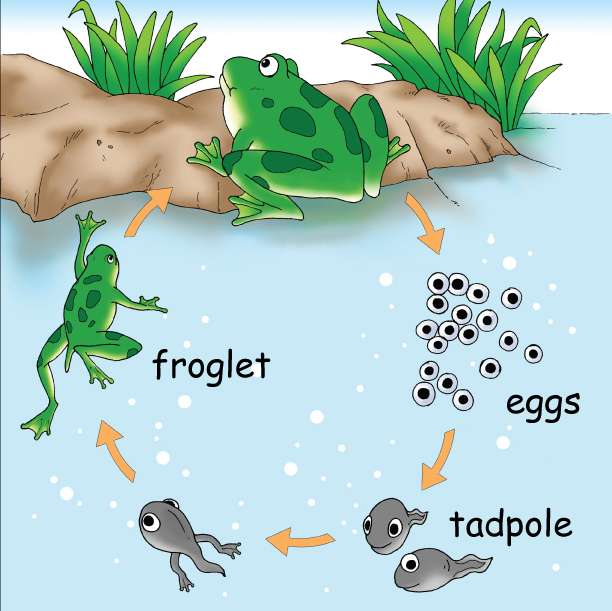 - A frog goes through four stages of life. It changes and grows at each stage. Frogs lay eggs. That’s where new frogs come from. The eggs hatch in one to three weeks.