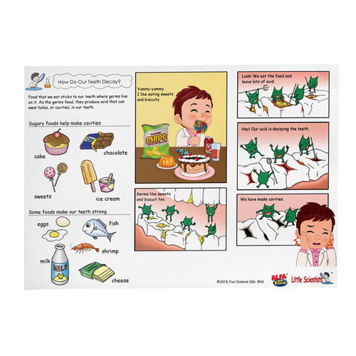 Explain to your child that the food we eat, especially sugary food, will leave some residue on our teeth. Germs and bacteria will eat the food residue, producing corrosive acid on the teeth. The acid will corrode the teeth and cause it to decay, leaving tiny holes and cavities on the teeth. This is why we need to brush our teeth regularly to clean away the residues.