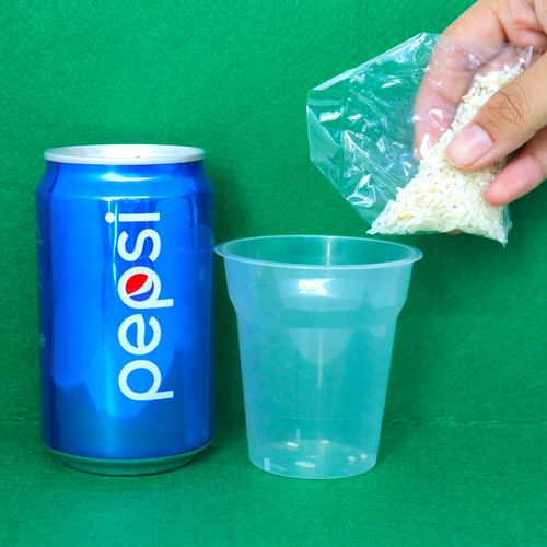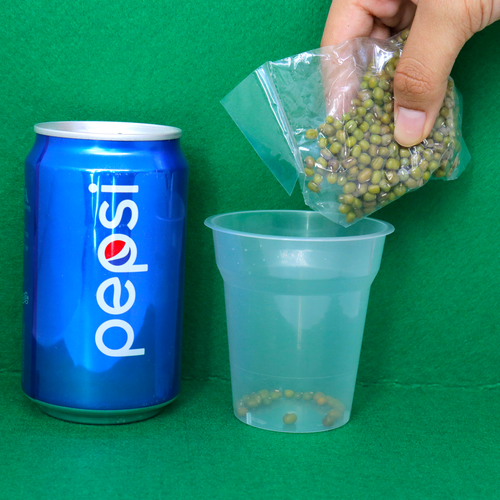 - Now, set up another two plastic cups with green beans in one cup and rice in the other. Close the lid of the cup.